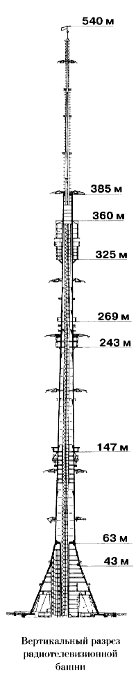 Останкинская башня стоит на монолитном фундаменте диаметром 74 м из предварительно напряженного железобетона: