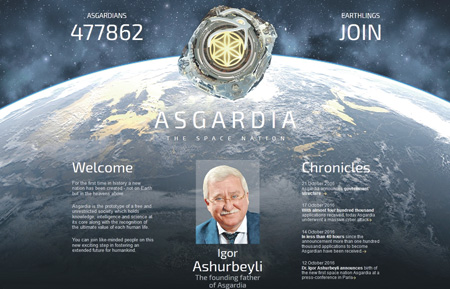 Прошло две недели – и еще одно нетривиальное заявление: 12 октября 2016 года гражданин России, доктор технических наук Игорь Ашурбейли на пресс-конференции в Париже провозгласил и кратко изложил идею и проект создания космической нации и первого космического государства ASGARDIA. По замыслу инициаторов и организаторов – международной группы ученых, инженеров, юристов и предпринимателей, планировалось объединить 100 тыс. человек и начать процесс оформления государства ASGARDIA в ООН. Но через два дня из-за потока людей, стремящихся влиться в новое государство, «стартовую квоту» увеличили до 1 млн человек.
