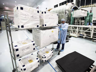On Feb. 7, 2017, in the Space Station Processing Facility at NASA's Kennedy Space Center, technicians and engineers load thousands of pounds of supplies, equipment and scientific research materials aboard a Cygnus spacecraft's pressurized cargo module for the Orbital ATK CRS-7 mission to the International Space Station.
