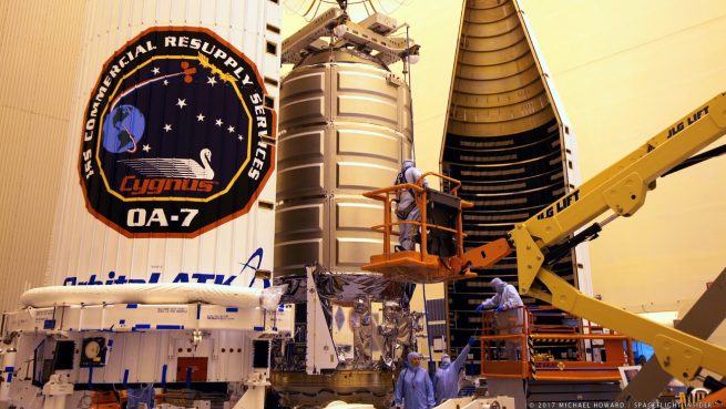 The OA-7 Cygnus is prepared for encapsulation inside the Atlas V 401 payload fairing. Encapsulation took place March 17, 2017. Photo Credit: Michael Howard / SpaceFlight Insider