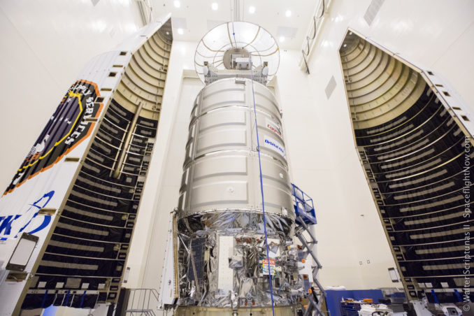 After the pressurized cargo module and the propulsion tug of Cygnus were mated together, the spacecraft was relocated to KSC's Payload Hazardous Servicing Facility to be loaded with 1,825 pounds of maneuvering propellant, the final stowage of cargo, closure of the hatch and encapsulation within the Atlas 5 rocket's 45-foot-long, 14-foot-diameter aluminum nose cone, the longest available in that diameter.