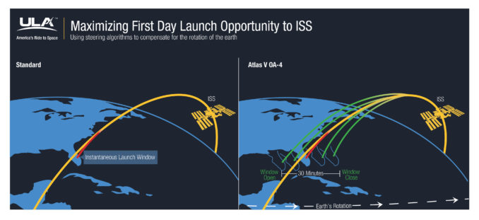 A 30-minute launch window, spanning 15 minutes before and 15 minutes after the exact moment the station's orbital plane passes over the Complex 41 launch pad, allows flexibility for the Atlas 5 to wait out unfavorable weather or seek resolution to a technical issue that could crop up in the countdown.