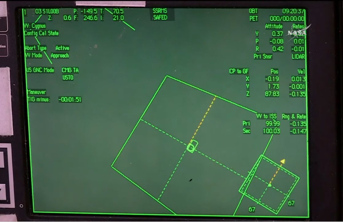 Cygnus reached its 820-foot (250-meter) waypoint from the station in this morning's rendezvous. All is reported nominal as this four-day trek from the launch pad nears the destination. The vessel is scheduled to hold at this position for 20 minutes for a review of onboard systems.