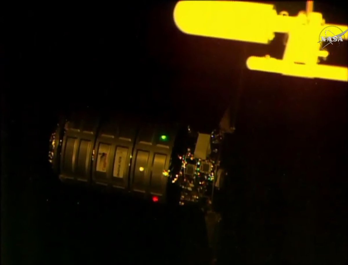 Canadarm2 of the International Space Station is in motion, reaching out to grab Cygnus. The two craft are orbiting 250 miles above Earth, just 39 feet apart.