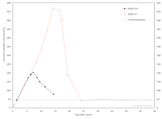 It is interesting to note the difference with the previous NOSS launch, NOSS 3-7, also depicted in the diagram. The latter initially drifted further apart, and for a longer time: the separation increased until 14 days after launch (double as long as for the current case), to as much as ~570 km (almost three times as large as the current case), before the two objects started to move closer again.