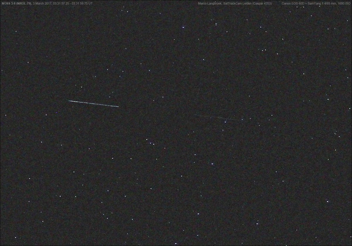 Tracked the classified #NROL79 payloads (a new NOSS duo, NOSS 3-  8)  from the March 1 launch tonight from #Leiden. Hazy sky, B-object faint.