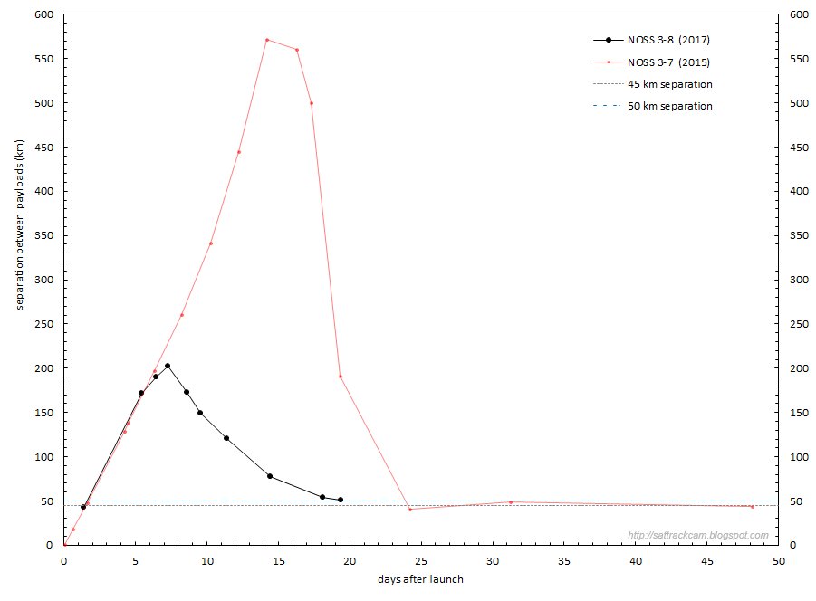In the initial week after launch the two payloads separated at a rate of ~31-32 kilometer per day, to a maximum separation of just over 200 km on Day 7. Then their drift reversed, with the two payloads gradually moving closer again (see diagram above, which also gives similar data for a previous NOSS launch, NROL-55 (NOSS 3-7) from 2015). Extrapolating the drift, and looking at the previous NOSS launch, I expect that by the end of the 3rd week after lauch (~March 23, 2017) the two payloads will reach their intended separation of ~45 km, and stabilize with respect to each other.