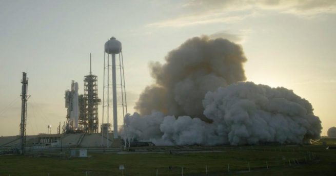 The Falcon 9 that will take EchoStar 23 into orbit conducts a static fire test on March 9, 2017, at LC-39A. Photo Credit: SpaceX