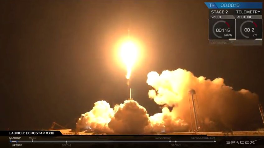 Старт был дан в расчетные 09:00 мск со стартовой площадки 39А. Ракета-носитель выводит на геостационарную орбиту спутник, принадлежащий корпорации EchoStar, предназначенный для передачи телевизионного сигнала странам Южной Америки.