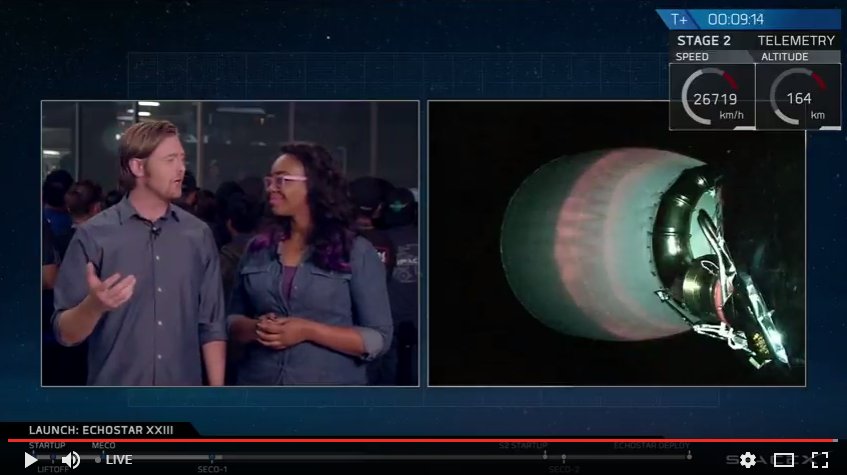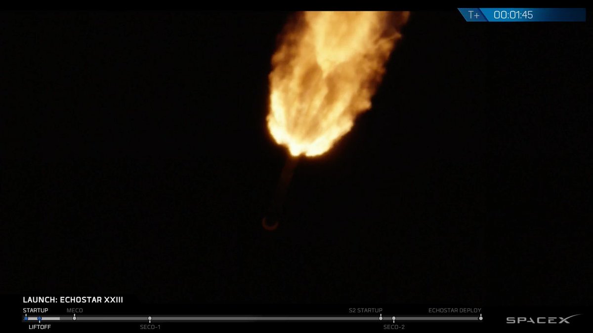 The Falcon 9's second stage engine has shut down after injecting the EchoStar 23 satellite into a preliminary parking orbit. The Merlin vacuum engine is due to restart at T+plus 26 minutes, 19 seconds, to put the EchoStar 23 spacecraft into a geostationary transfer orbit.