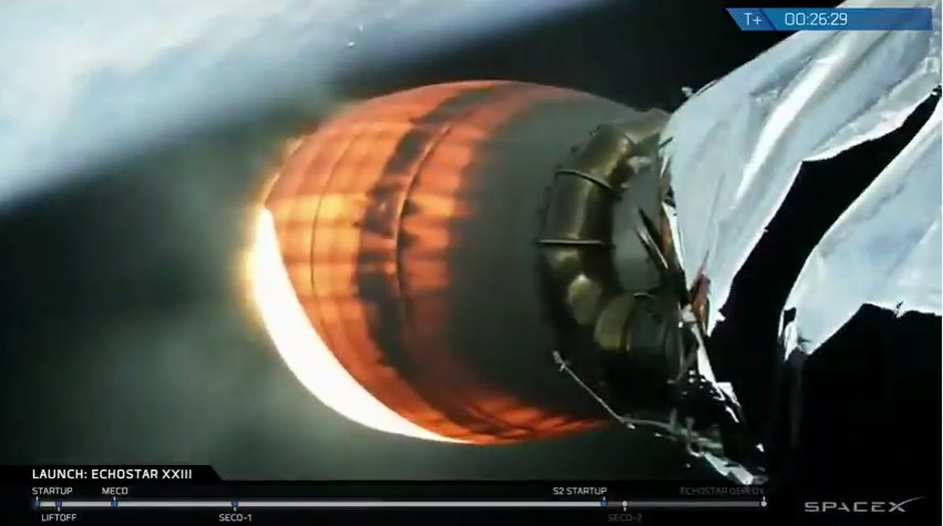 SpaceX confirms a nominal insertion of the EchoStar 23 satellite into a geosynchronous transfer orbit. Separation of the spacecraft from the upper stage is planned at T+plus 34 minutes.