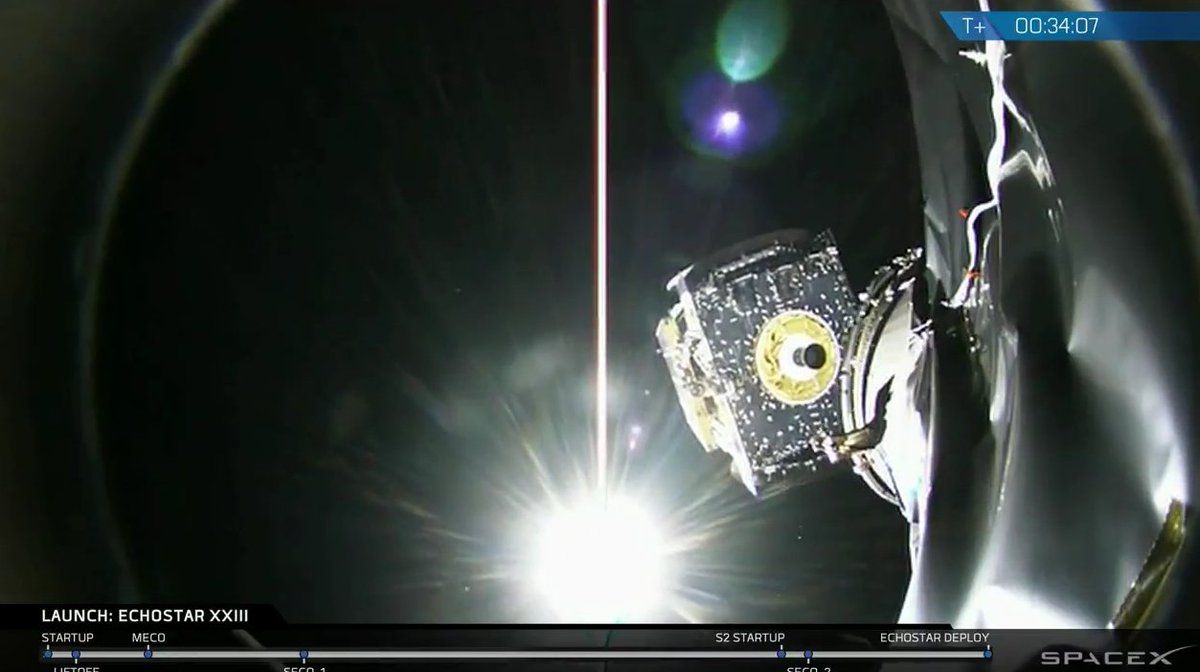 The EchoStar 23 spacecraft has deployed from the Falcon 9 rocket's second stage, beginning a 15-year mission to provide direct-to-home television services over Brazil, as well as support other telecom missions.
