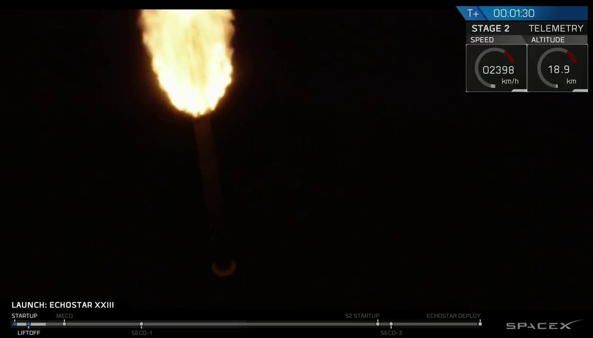 SpaceX confirms a nominal insertion of the EchoStar 23 satellite into a geosynchronous transfer orbit. Separation of the spacecraft from the upper stage is planned at T+plus 34 minutes.