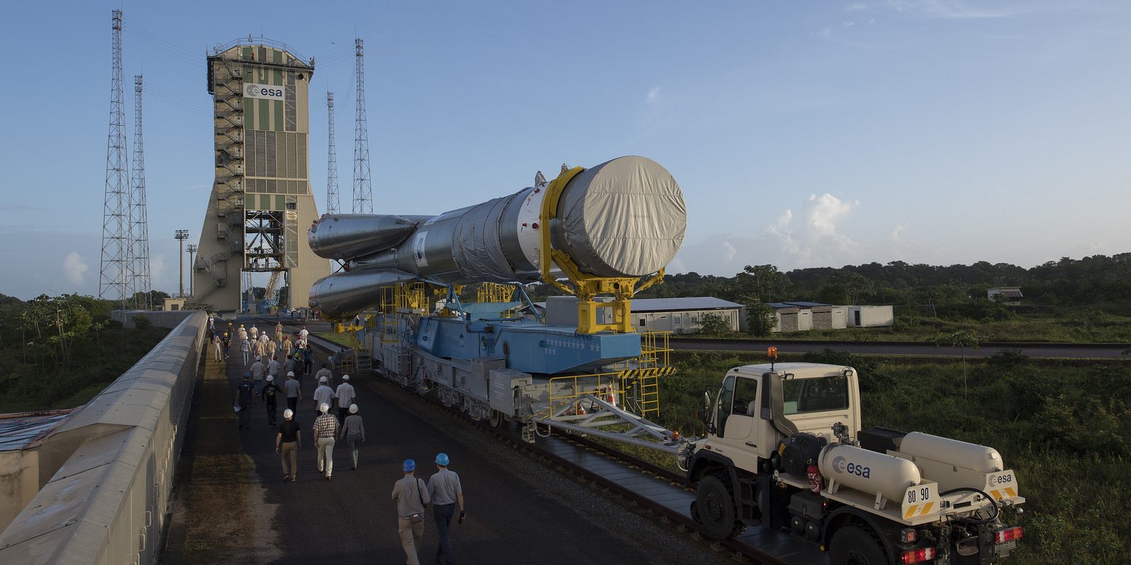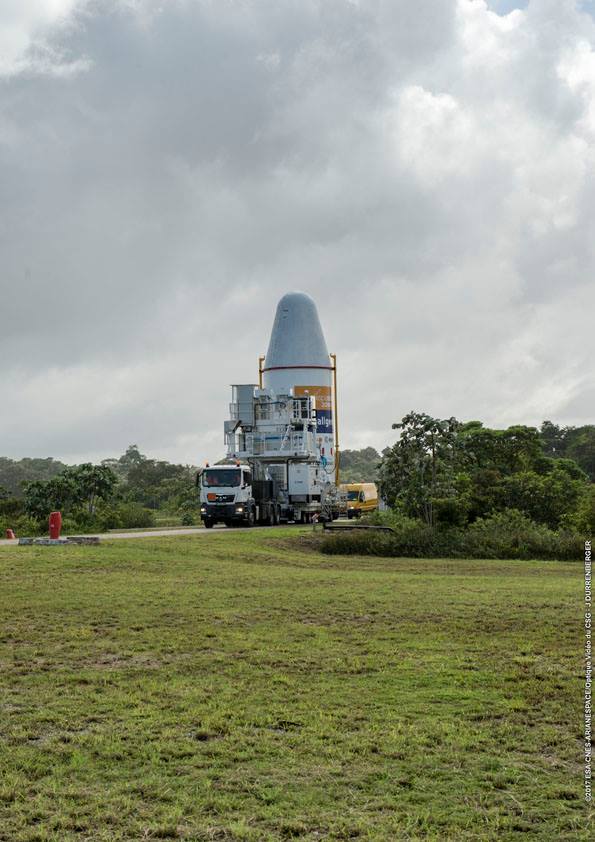 An Arianespace Soyuz ST-B (flight VS16) being transferred from the preparation building MIK to the Soyuz launch zone of Europe's Spaceport in French Guiana on Jan. 24, 2017. Photo Credit: Stephane Corvaja / ESA