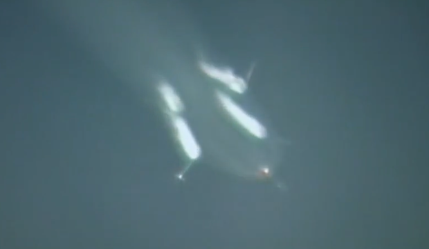 The Soyuz rocket's four strap-on boosters, each powered by an RD-107A engine, are jettisoned after consuming their propellant.