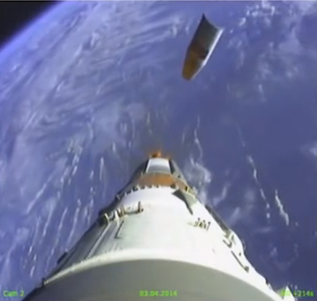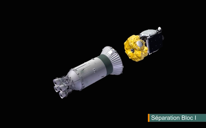 The Soyuz rocket's third stage releases the Fregat-MT upper stage just shy of orbital velocity.
