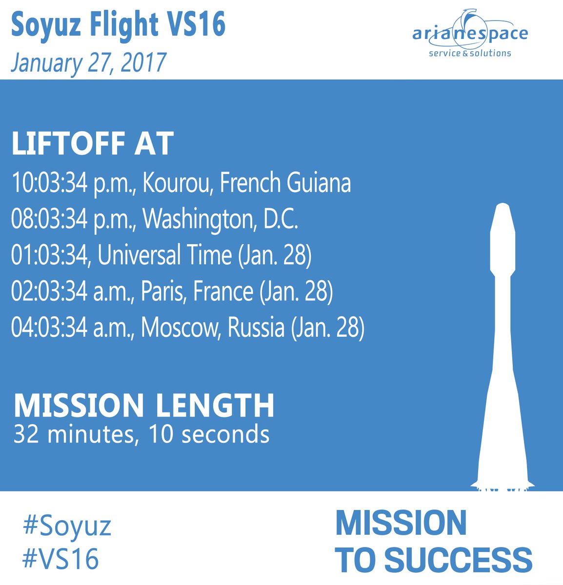 Mark your calendars! Our first flight of 2017 is set for January 27 at 10:03 PM French Guiana time, with #Soyuz launching @Hispasat 36W-1