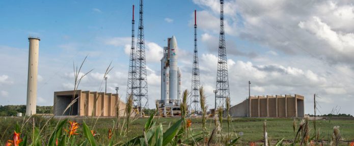 An Ariane 5 success for long-time partners maintains Arianespace's 2017 launch tempo                                                            The Ariane 5 for Flight VA235 is shown at the Spaceport's ELA-3 launch zone, ready for liftoff with its SKY Brasil-1 and Telkom 3S satellite passengers.