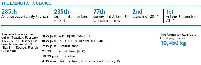 Shortly after the announcement of the orbital injection of the two satellites, Stéphane Israël, Chairman and CEO of Arianespace, said: "Arianespace carried out its first Ariane 5 launch of the year this evening for our American and Indonesian customers, also marking the 77th successful launch in a row of our heavy launcher. We are both pleased and proud to have carried out this successful mission in the presence of Christophe Sirugue, French Minister of State for Industry; and Jean-Luc Moudenc, Mayor of Toulouse and President of the Community of Ariane Cities for 2017. We are honored by the ongoing trust expressed by the operators AT&T/DIRECTV, for whom we have orbited 10 satellites since 1993, and Telkom Indonesia, for whom we have launched all satellites now in operation. I would also like to thank our long-standing partners Airbus Defence and Space and Thales Alenia Space, who built the two satellites launched on this mission.