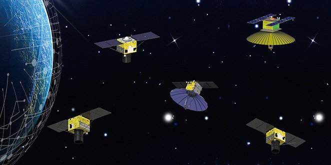 Artist's concept of Beijing Space View's planned constellation of optical and radar imaging satellites. The spacecraft illustrated at upper left is one of the SuperView 1 satellites launched Wednesday. Credit: Beijing Space View