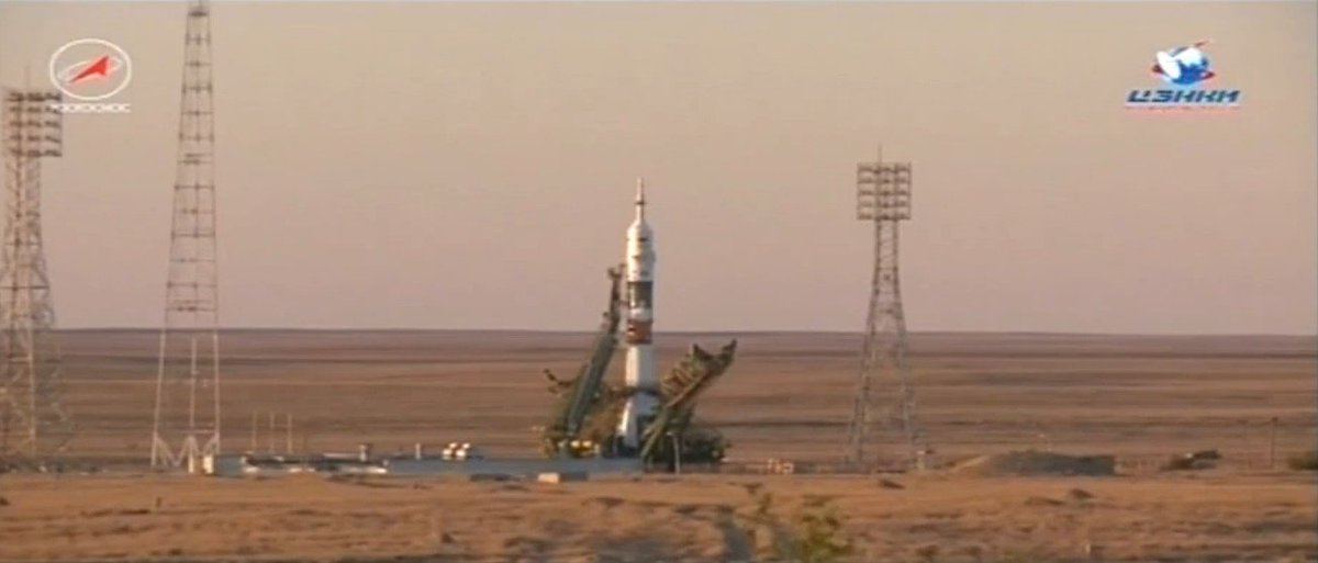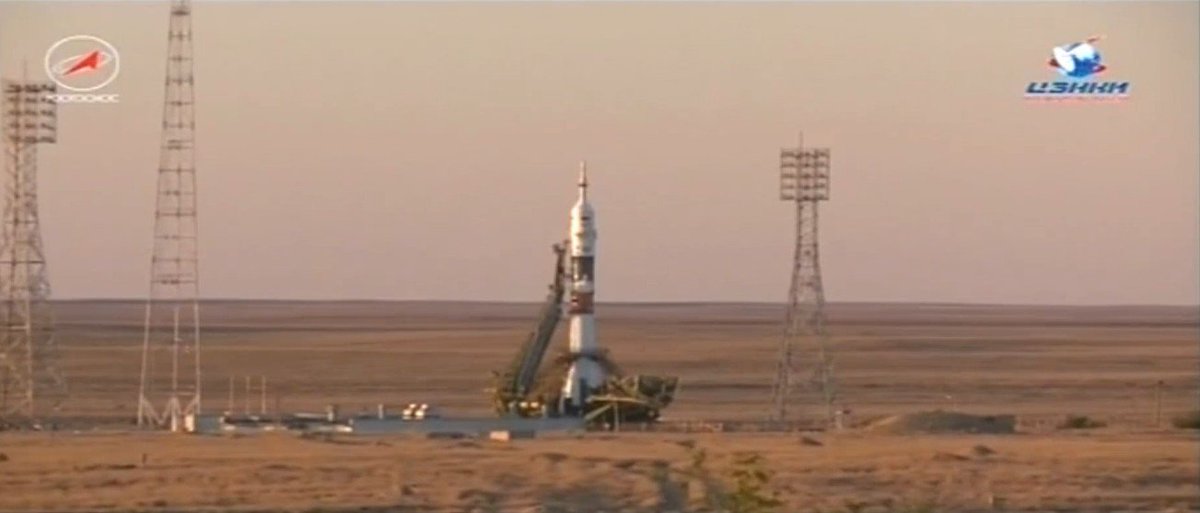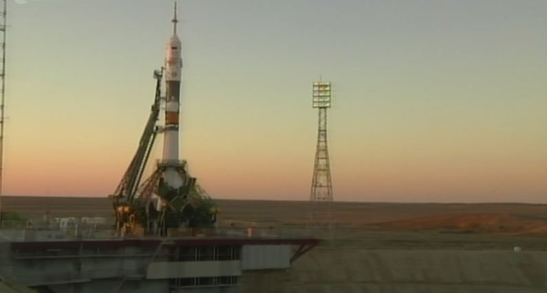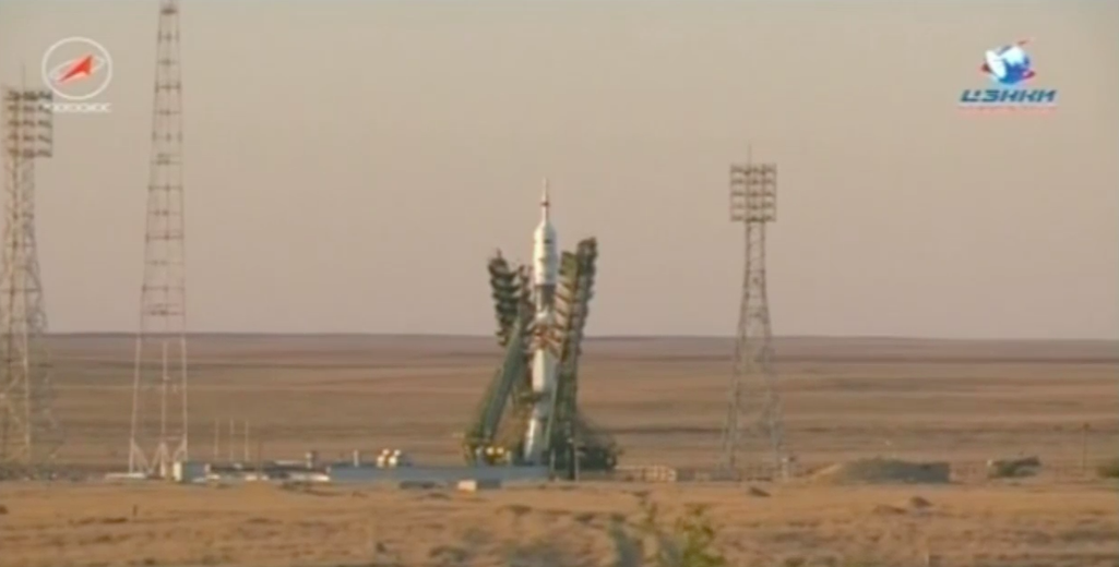 T-minus 30 minutes and counting. The emergency escape system is being armed. The system would be employed if a major malfunction occurs, propelling the Soyuz capsule off the top of the rocket to safety.