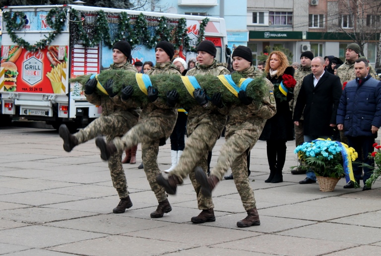 После возложения цветов почетная рота солдат Житомирского военного института имени С.П. Королёва прошлась торжественным шествием с оркестром.