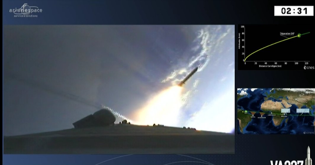 The Natal tracking station in Brazil is now providing telemetry from the #Ariane5, covering staging & the initial phase of the Stage 2 burn.