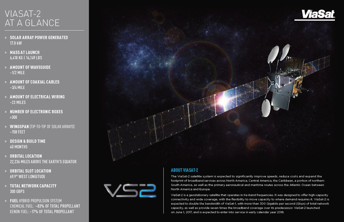 Released first will be ViaSat-2, which is expected to bring considerable improvements in terms of speed, lower costs and extended broadband coverage within its footprint, which includes North and Central America, plus the Caribbean, northern South America, and the aeronautical and maritime routes in the Atlantic Ocean between North America and Europe. As a global broadband services and technology company, ViaSat operates from corporate headquarters in Carlsbad, California.