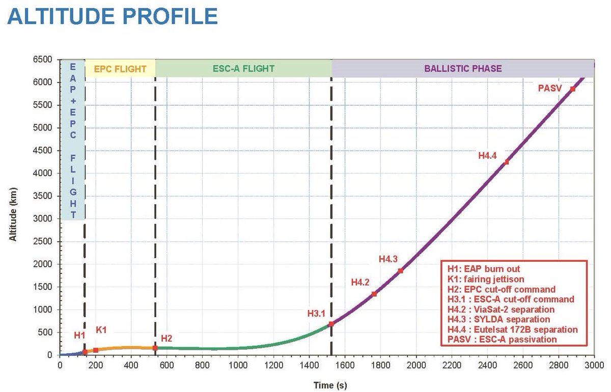 ViaSat-2 will be released first during tomorrow's nearly 42-minute mission, which is designated Flight VA237 in Arianespace's launcher family numbering system. The spacecraft – with a liftoff mass estimated at 6,418 kg. – will be operated from an orbital position of 70 deg. West by ViaSat, a global broadband services and technology company based in Carlsbad, California.