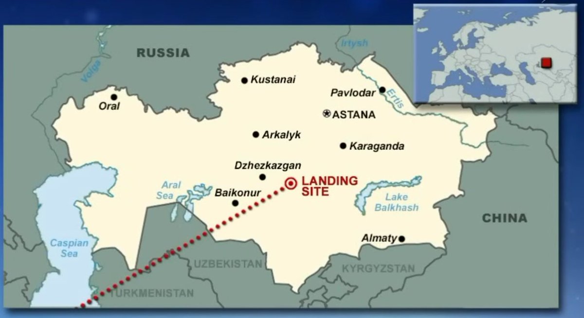 Helicopters now getting airborne from Zhezkazgan to be in position over the prime landing site. Ten helicopters are headed to the primary site, two are taking off from Baikonur to circle the ballistic site 450km short of the bullseye target.