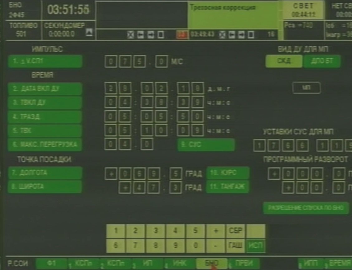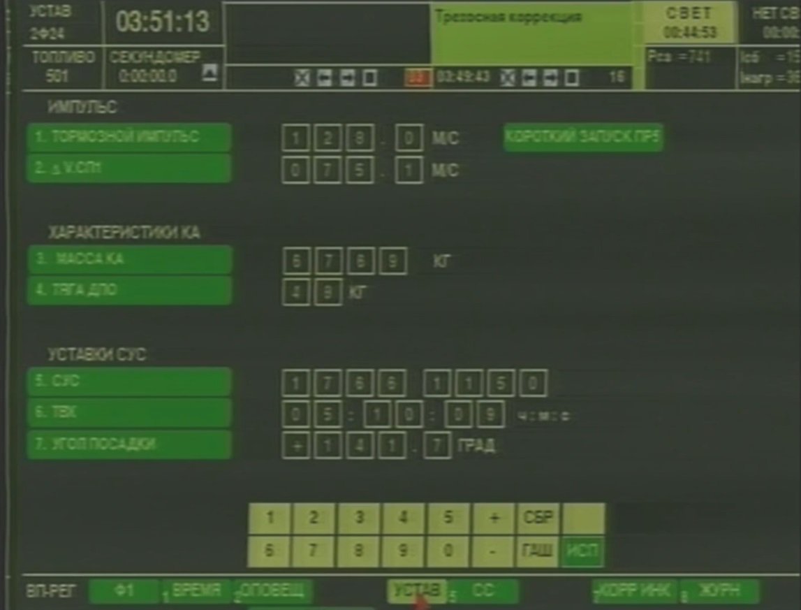 Final verification of deorbit burn parameters loaded into the Digital Flight Control System of the #Soyuz.
