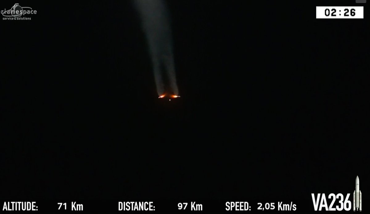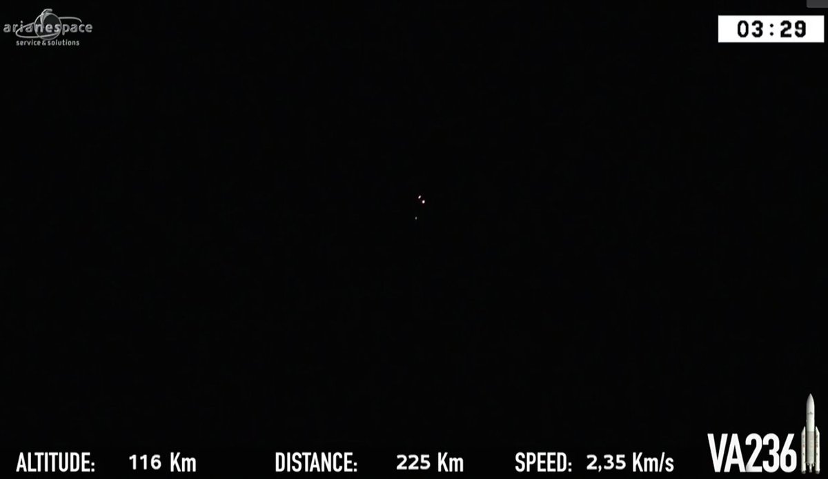 Plus+3 minutes, 30 seconds. Separation of the rocket's nose cone has been confirmed. The Ariane 5 core stage will continue burning until about Plus+9 minutes into the mission.