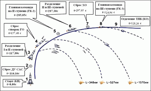 Four minutes and 45 seconds into the flight, the Core Stage will shut down its engine, marking the beginning of the hot staging sequence. Two seconds after cutoff, the third stage's RD-0110 engine will be commanded to ignite and, at the same time, pyrotechnic bolts in the interstage will be fired to severe the connection between the empty Core Stage and the upper stage of the Soyuz that will continue powered ascent while the core heads toward re-entry and impact 1,570 Kilometers downrange from the launch site.