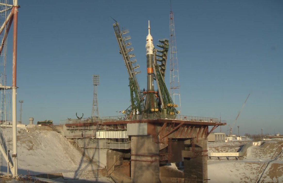 Around L-3 hours, the crew will depart Site 254, reporting to officials and boarding a bus for a half-hour ride to Site 1/5 that is hosting its 509th launch. Getting off their bus, the crew members will have a look at their fully fueled rocket, take a few photos with officials present at the pad and walk over to the Service Structure stairs to wave good-bye and enter the elevator taking them up to their Soyuz for crew ingress.