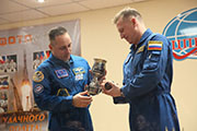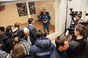 Также на пресс-конференции космонавты представили журналистам флаг Worldskills 2019, который отправится на орбиту, шайбу и мини Кубок ГАГАРИНА.