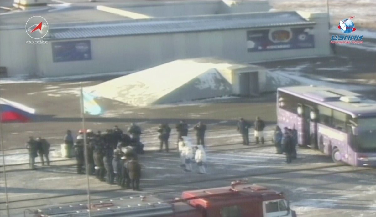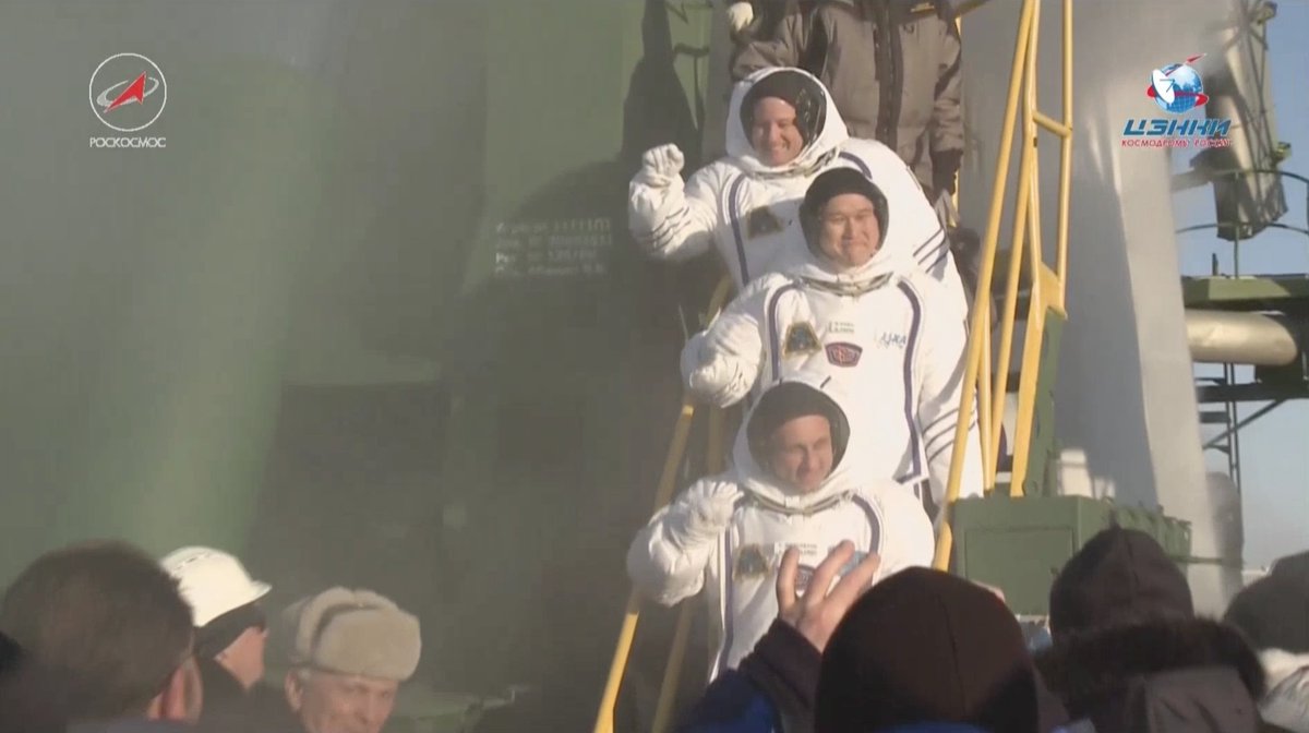#СоюзМС07: автобус с экипажем прибыл на стартовую площадку №1 космодрома #Байконур. Через несколько минут они поднялись на лифте в корабль, где в скором времени займут места в ложементах. Пуск запланирован в 10:21 мск - http://online.roscosmos.ru .