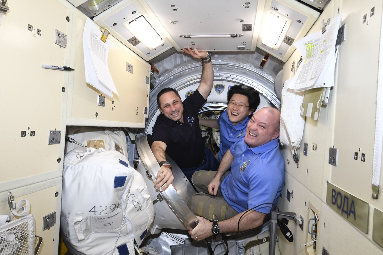 Expedition 55 crew members Anton Shkaplerov, Norishige Kanai and Scott Tingle pause for a final portrait before entering their Soyuz MS-07 spacecraft for the ride home. Credit: @OlegMKS