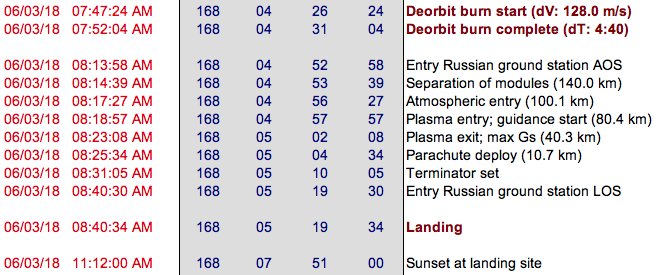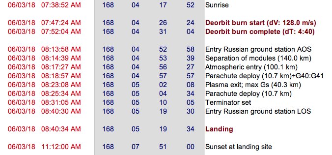 SoyuzMS07: Standing by the the Soyuz MS-07/53S deorbit burn; ignition expected at 7:47:24am; planned duration is 4 minutes 40 seconds, change in velocity is 286 mph; here is a timeline of events: