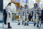 The trio was in Star City today talking to journalists before heading to Moscow to tour Red Square and lay flowers at the Kremlin Wall wh ere famed cosmonauts are interred. Next, the crew will head to the launch site Dec. 4 at the Baikonur Cosmodrome in Kazakhstan wh ere they will stay for final launch preparations at the Cosmonaut Hotel.