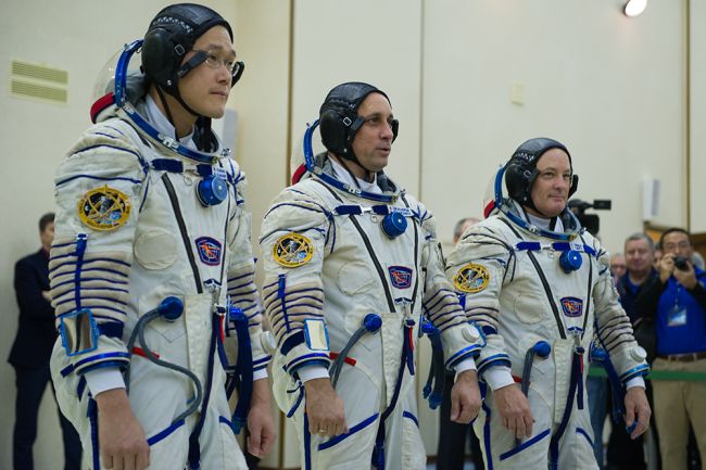 Астронавт НАСА Скотт Тингл, космонавт Роскосмоса Антон Шкаплеров и астронавт ДжАКСА Норишиге Канаи