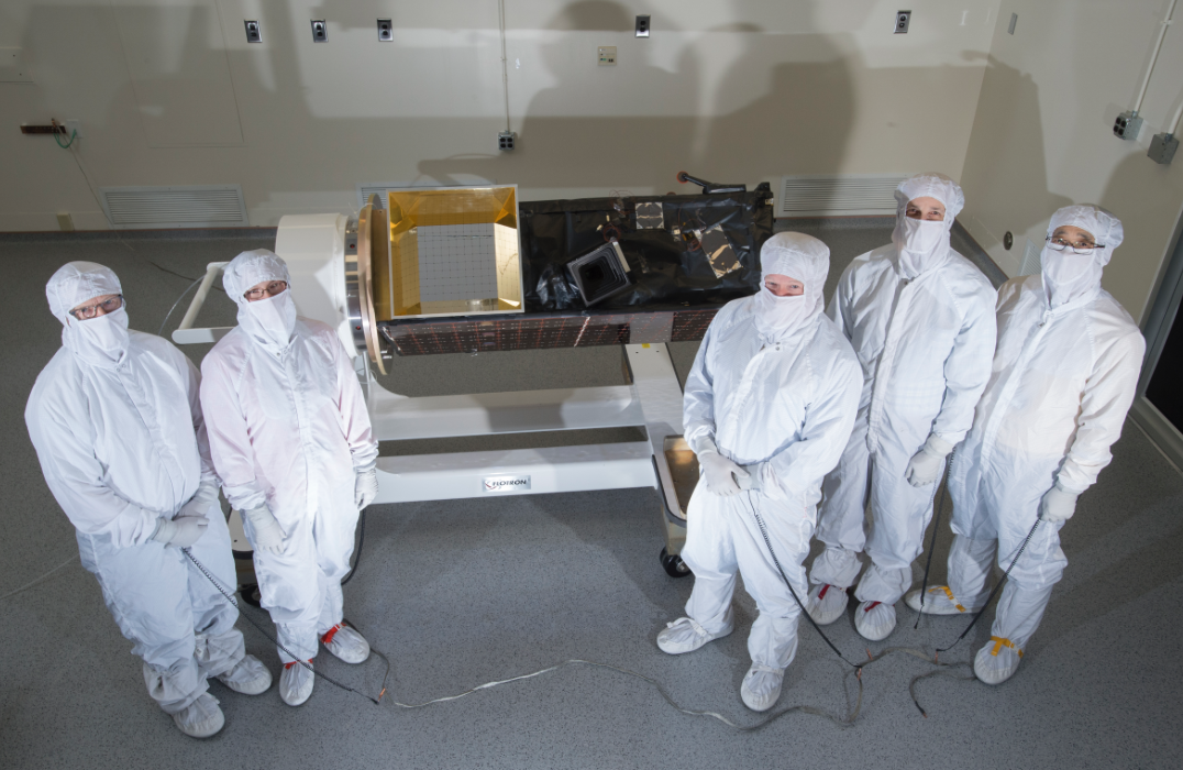 The Massachusetts Institute of Technology's Lincoln Laboratory engineering team stands in front of the Operationally Responsive Space (ORS)-5 satellite in the MIT LL clean room at the Lexington, Massachusetts facility, prior to shipment for final processing and stacking atop an Orbital ATK Minotaur IV launch vehicle at Launch Complex 46, Cape Canaveral Air Force Station, Florida. From left to right: Joe Warfel - Assembly Technician; Michele Weatherwax - Mechanical Engineer; Al Pillsbury - Mechanical Engineer; Marshall Solomon - Thermal Engineer, and; Eui Lee - Thermal Engineer. ORS-5, also known as SensorSat, is a single satellite constellation with a primary mission to provide space situational awareness. It measures about five feet long, two and a half feet wide, and weighs about 250 pounds. It will operate from a low, zero inclination orbit approximately 372 miles above the earth to aid the U.S. military's tracking of other satellites and space debris in geosynchronous orbit, 22,236 miles above the equator, commonly used by defense-related communications satellites, television broadcasting stations, and international space platforms. (Courtesy photo: MIT LL).