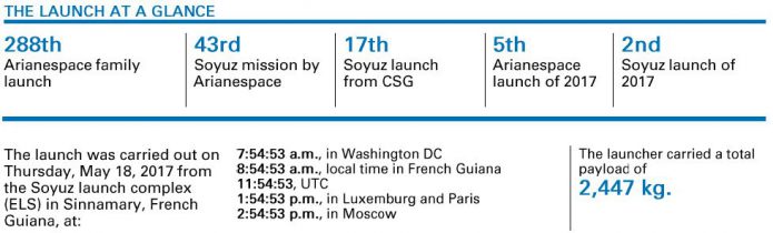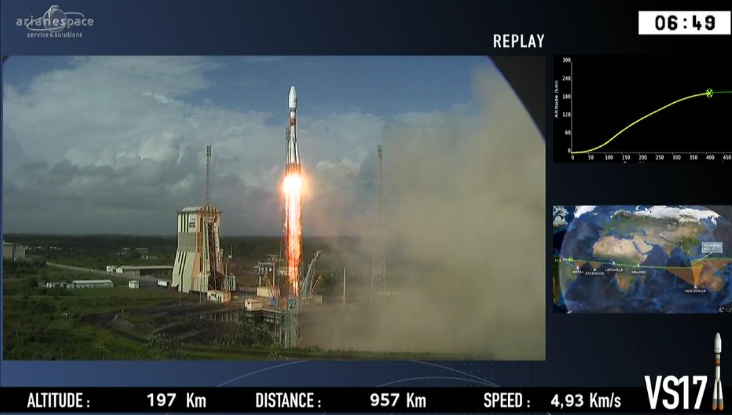 Departing from the Spaceport's ELS launch complex adjacent to the commune of Sinnamary, Flight VS17 delivered a total payload lift performance set at 2,447 kg; it was Arianespace's fifth mission of 2017 and the Russian-built Soyuz' 17th liftoff from French Guiana since this vehicle's 2011 introduction at the Spaceport.