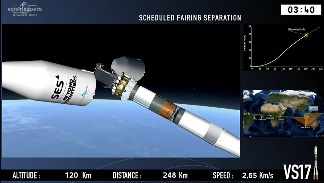 The flight, designated VS17 in Arianespace's launcher family numbering system, lasted 5 hrs., 18 min. fr om the precise liftoff at 08:54:53 a.m. (local time in French Guiana) to payload separation. It carried SES' first satellite lofted by the medium-lift Soyuz launcher and the 40th overall for the operator launched by Arianespace.
