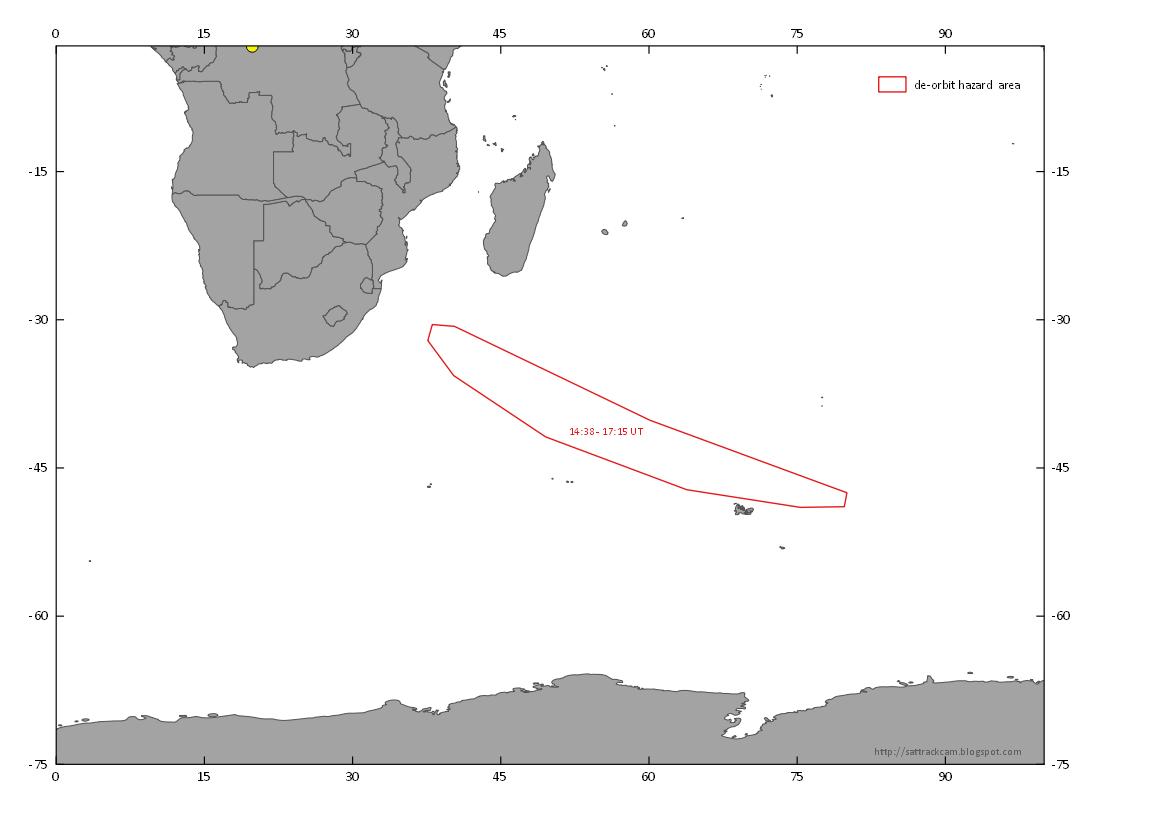The second area, in the Indian Ocean, points to the de-orbit of the upper stage about 4.5 hours after launch and actually matches a launch into an ~51 degree inclined LEO orbit as well.