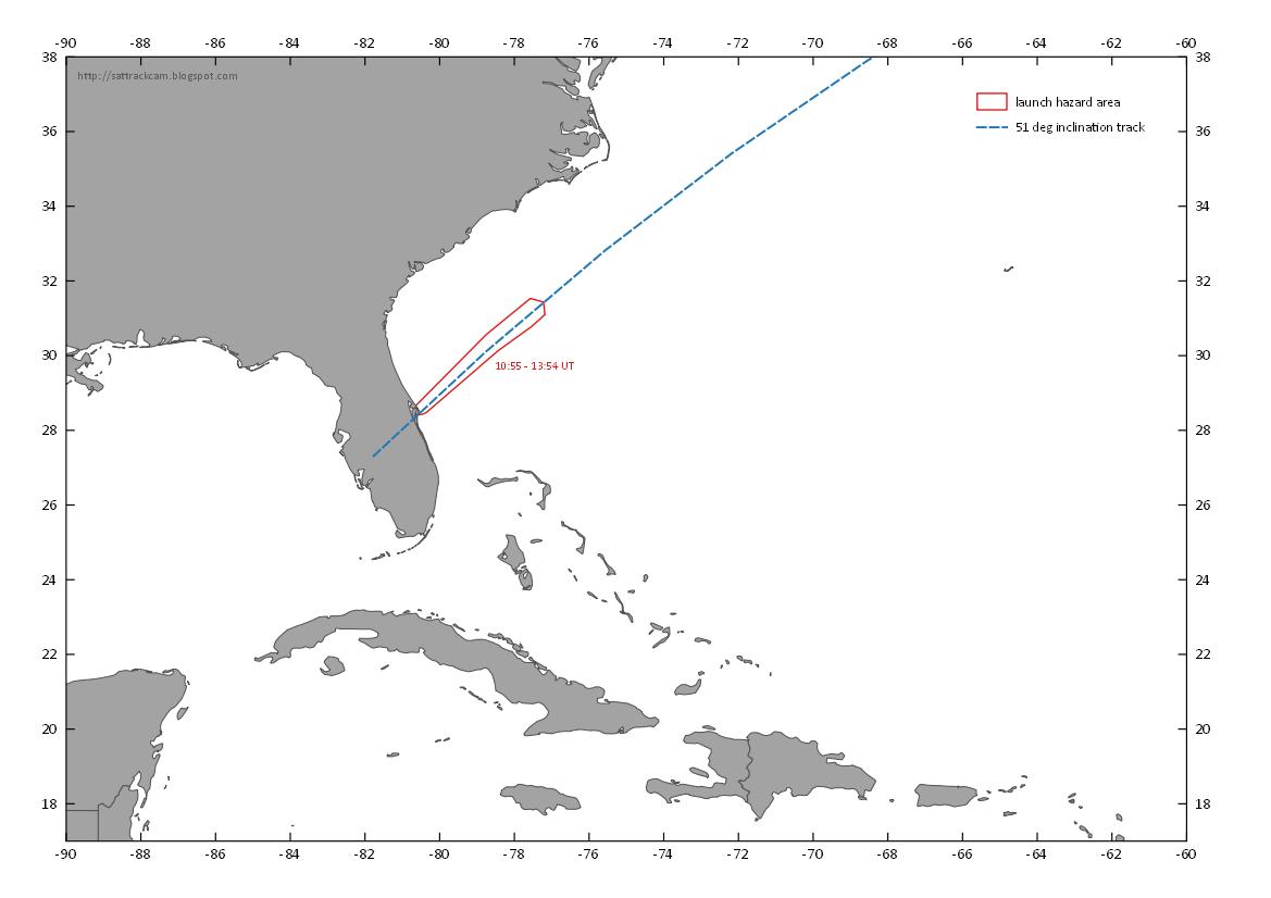 If the 51-degree orbital inclination scenario is correct, observers in the Northern hemisphere will, unfortunately for me, not have visual sighting opportunities after launch: optical detection will rest on the shoulders of Southern hemisphere observers.