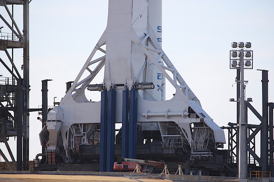 The 229-foot-tall rocket was lifted vertical Saturday morning atop the historic launch complex, wh ere the Apollo moon landing missions took off.