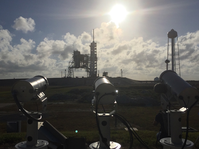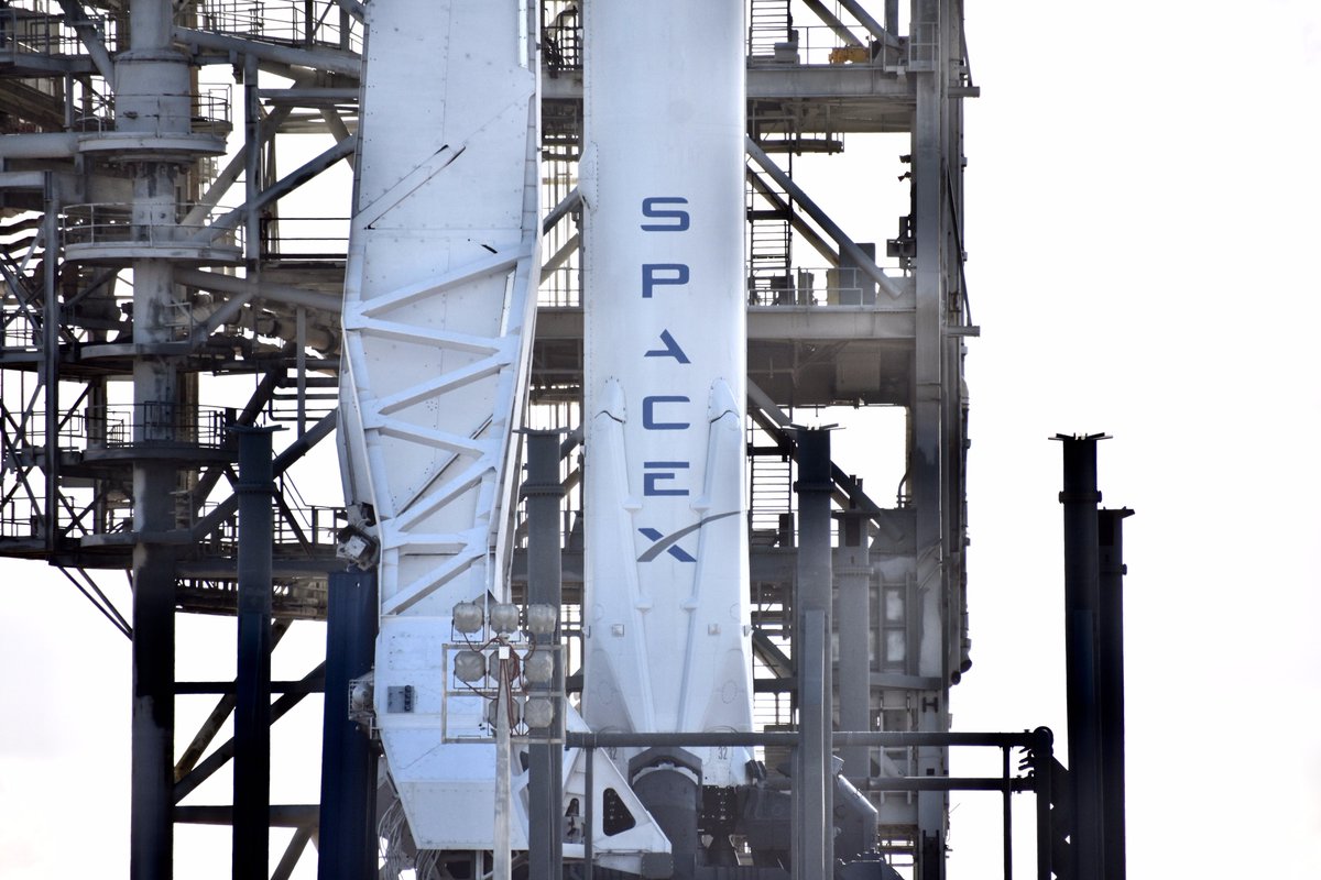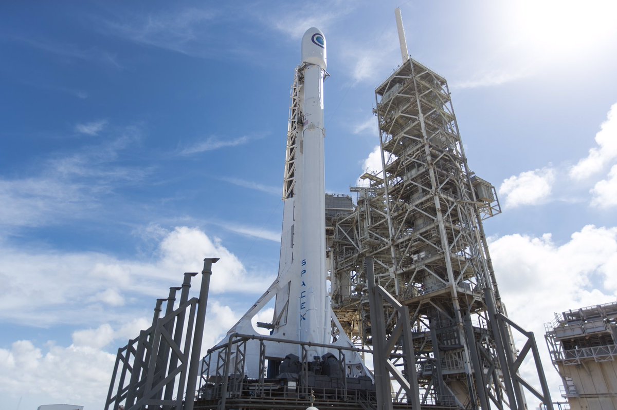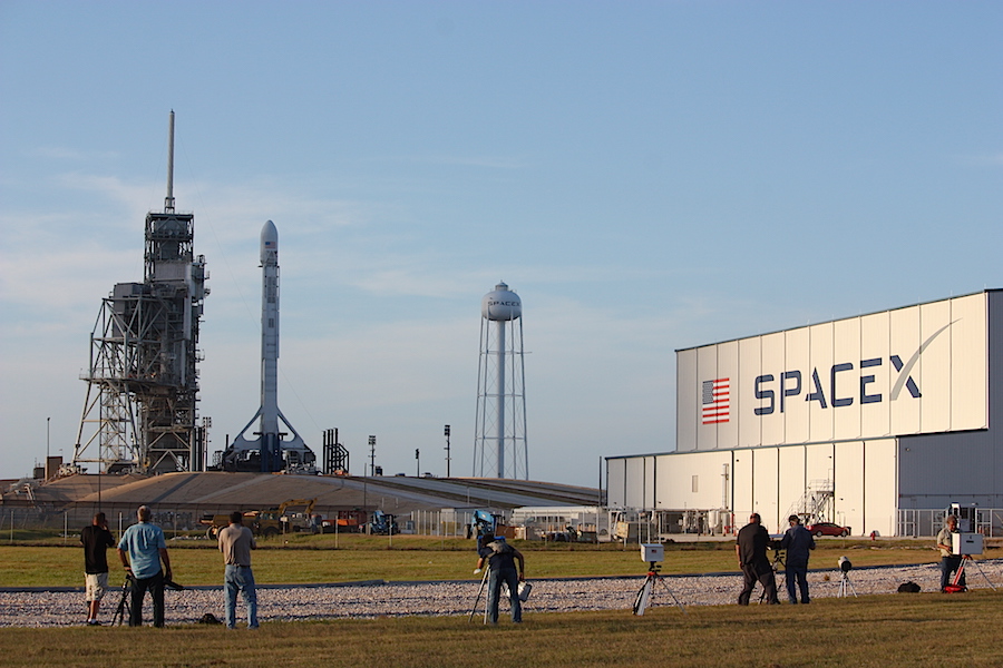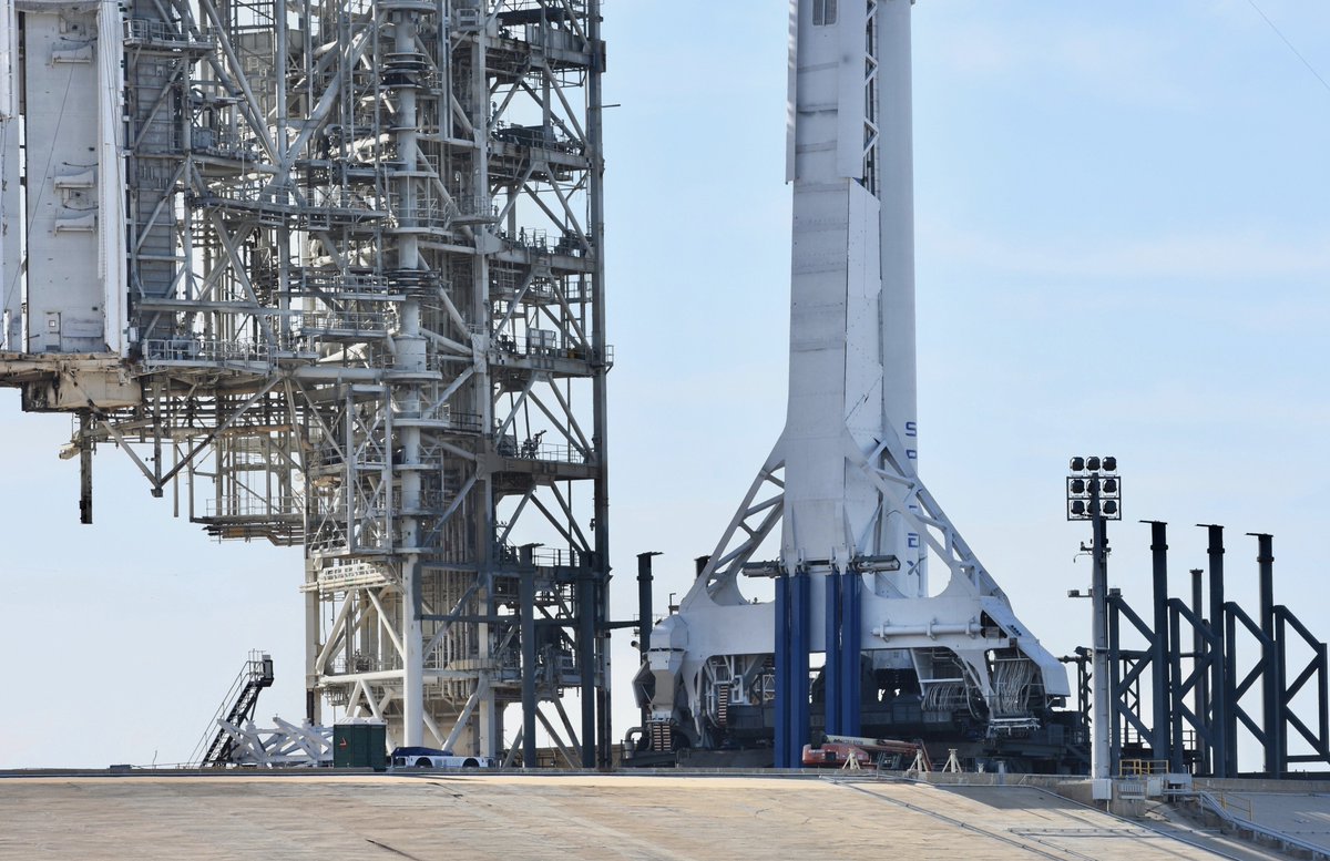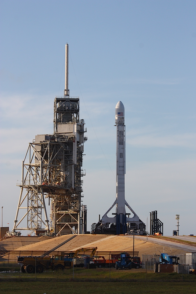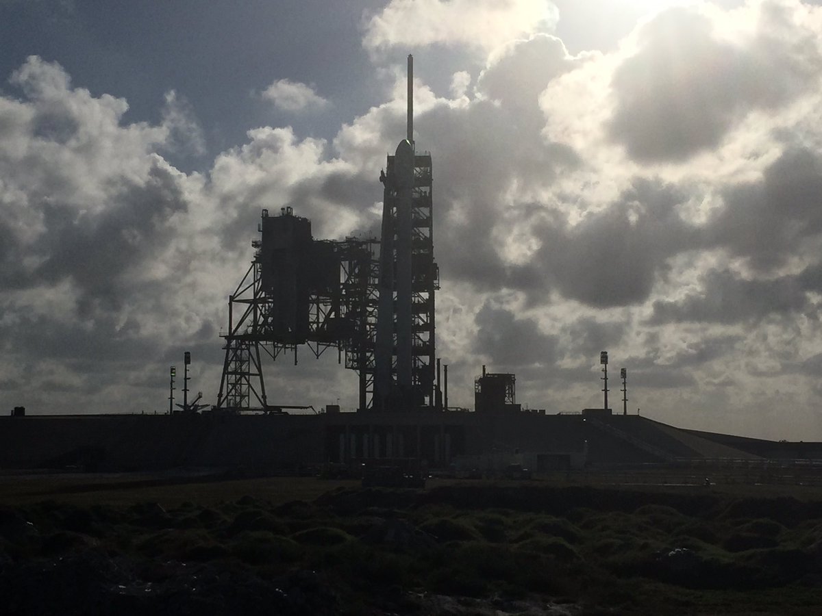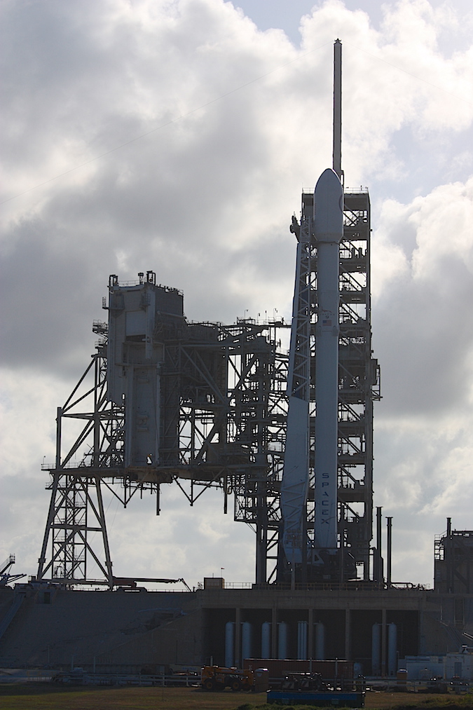 The two-stage rocket stood vertical on launch pad 39A at NASA's Kennedy Space Center on Saturday evening as photographers set up remote cameras to document the liftoff.
