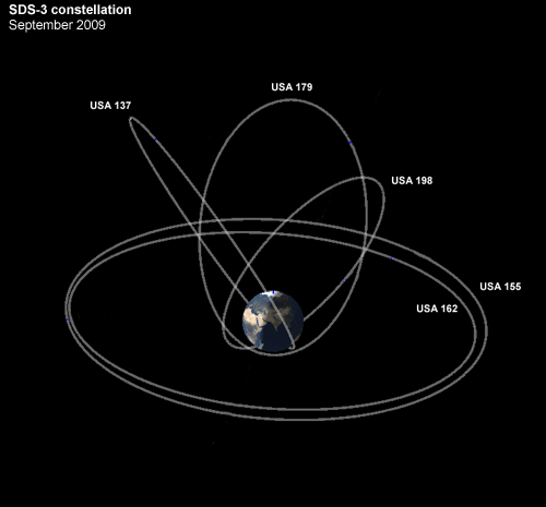 SDS, also known under the code name Quasar, operates relay satellites in Geostationary and Molniya Orbits to provide real-time downlink of imagery from low-orbiting reconnaissance satellites, notably the Keyhole electro-optical reconnaissance satellites and Lacrosse/Topaz radar assets. The SDS constellation typically consisted of at least two satellites in Geostationary Orbit and three in Molniya Orbits at the proper spacing to allow each to be over the northern hemisphere for eight hours to create 24/7 coverage.