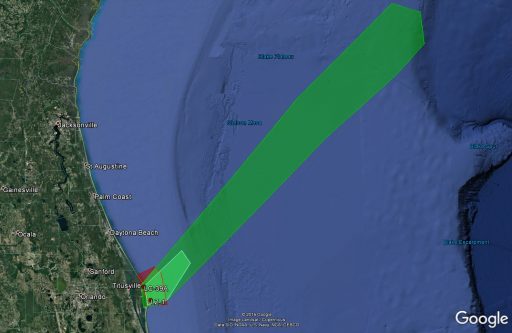This indicates that the payload will be placed into an inclined orbit, and is definitely not bound for geosynchronous orbit. The hazard area off the coast of Florida suggests an orbit inclined at around 50 degrees, although the rocket could perform a dogleg maneuver during second stage flight to increase the inclination.