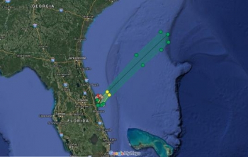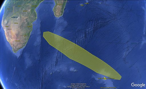 The most valuable clue for this mission is found in the launch hazard areas that reveal the orbital inclination this mission is headed to. Two safety areas have been identified through the typical NOTAMs (Notices to Airmen and Mariners), the first corresponding to the direct launch corridor out of Kennedy Space Center and another south east of South Africa, likely corresponding to the deorbit of the second stage.